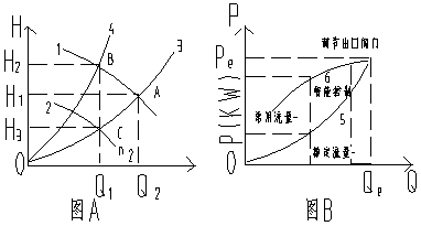 采用恒压(恒温)智能控制节电器,控制水泵运行,是目前供水系统节能改造的有效途径之一,图A和图B给出了阀门调节和智能控制节电器两种运行状态的压力——流量(H-Q)关系及功率——流量(P——Q)关系。