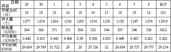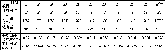 前后相比,10天供水量几乎相等,而耗电减少1720KWH,平均单耗降低0.136KWH,节电率24.37%,平均时耗降低9.942KW/H,节电率25.37%,平均节电率达24.87%,节电效果显著。
